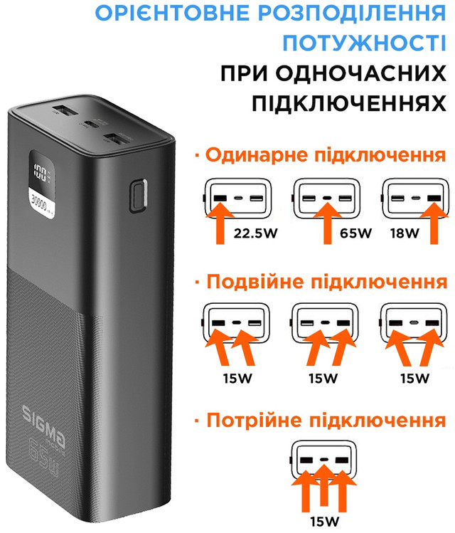Павербанк ємністю 30 000 мАг, із максимальною вихідною потужністю до 65 Вт.