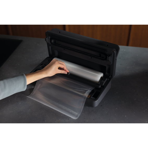 Зручна вбудована ручка для легкого доступу до пакетів. Пристрій постачається з тримачем для рулону й різаком, які допомагають швидко підготовлювати пакети й пакувати продукти.